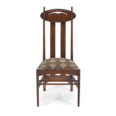 Note: Billcliffe alludes to "six smaller variants" of the high backed Argyle Street tea Room chair, designed by Mackintosh for Miss Cranston in 1898, two of which bear the Marsh, Jones Cribb & Co. label. Billcliffe goes on to suggest that as the firm only existed from 1897-1904 it is likely that that they had seen the larger chairs, either in Glasgow or at the Arts & Crafts Exhibition in 1899, and amended the design to this smaller version.