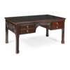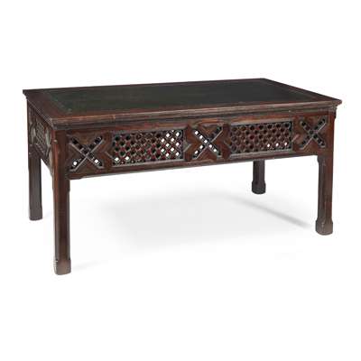 the rectangular top with inset leather writing surface, above leaf-carved kneehole with four drawers, the sides with fretwork panels, the whole raised on square chamfered legs