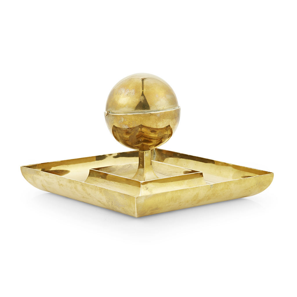 the spherical inkwell with revolving lid, with original glass liner, raised on a tapering column within a shaped square dish, stamped maker's marks WIENER WERKSTÄTTE/ MADE IN AUSTRIA with artist's monogram