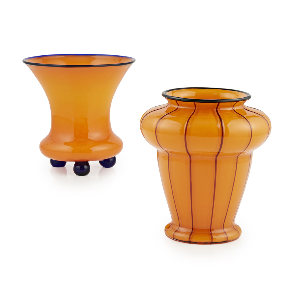 each in orange glass, the first of shouldered form with black striping, 15cm high; the other of fluted form, raised on three blue glass feet, 14.5cm high (2)