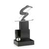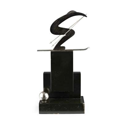 of stylised form with chromium plated metal skis and poles, raised on an ebonised and stepped wooden base, unmarked