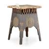 the square top with distressed vellum cover raised above a blocked frieze and base with applied pierced roundels and hammered brackets