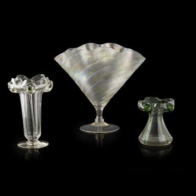 each with applied green glass decoration, 16cm and 10cm; and a JOHN WALSH WALSH GOBLET, the opaline brocade frilled bowl on clear cylindrical stem and conical foot, 22cm high (3)