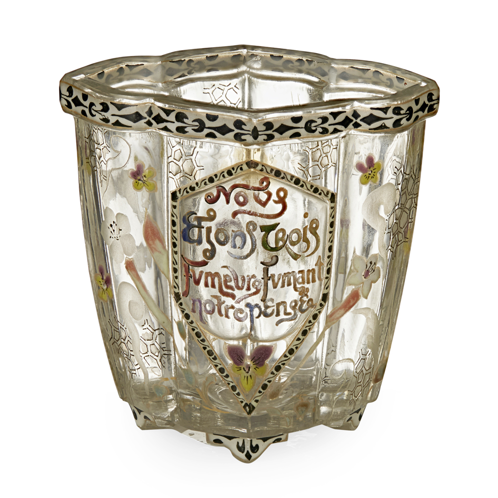 etched with flowerheads and scrolls and overlaid with enamel and gilt, bears enamelled inscription NOUS ETIONS TROIS FUMEURS FUMANT NOTRE PENSE, signed under base É. GALLÉ/ DEPOSE (shallow rim chip)