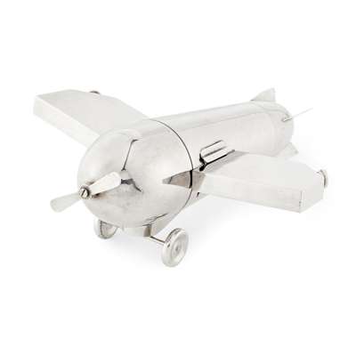 the fuselage containing a screw top flask, cocktail shaker with strainer, four 'tot' cups, and funnel, the undercarriage containing four stirring spoons, the 'wings' formed as removable hip flasks and the tail containing a corkscrew, stamped manufacturer's marks DRGM 89438/J.A. HENCKELS, TWIN WORKS, SOLINSEN, GERMANY