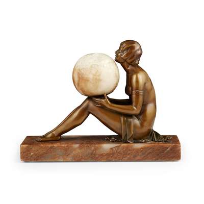 cast as a seated girl, holding an alabaster spherical shade and raised on a marble plinth