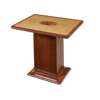the rectangular cross-banded top with central marquetry panel of specimen woods, raised on a square column with plinth base