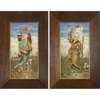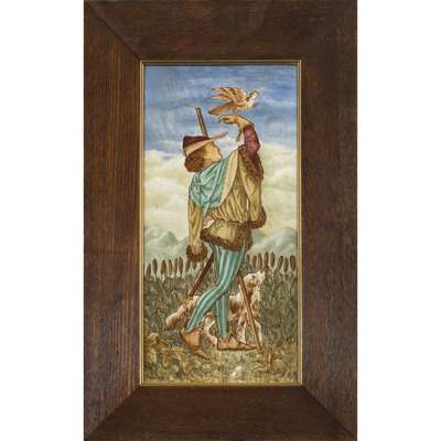 painted as a Medieval falconer and his companion in a landscape, impressed maker's marks verso, framed and glazed (2)