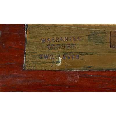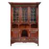 the projecting cornice with embossed copper frieze bearing the inscription READING MAKETH A FULL MAN, above twin leaded and glazed doors enclosing shelves above an open shelf and two linenfold panelled doors enclosing fitted interiors, centred by a single drawer and void and raised on square tapered legs