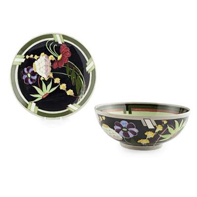 decorated with stylised flowers on a black ground, painted marks R.A. BOUGH/ VC/ 2/620/ MADE IN SCOTLAND, 30cm diameter; and a BOWL, of similar decoration, painted marks R.A. BOUGH/ 4/620, 23cm diameter (2)