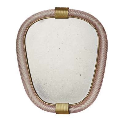 the oblong plate encased in brass supports surrounded by a band of pink twisted glass