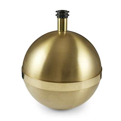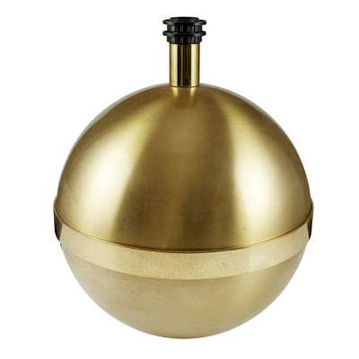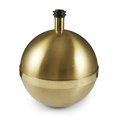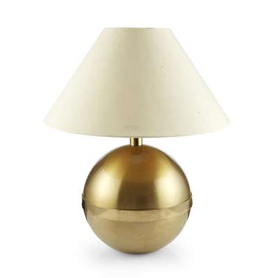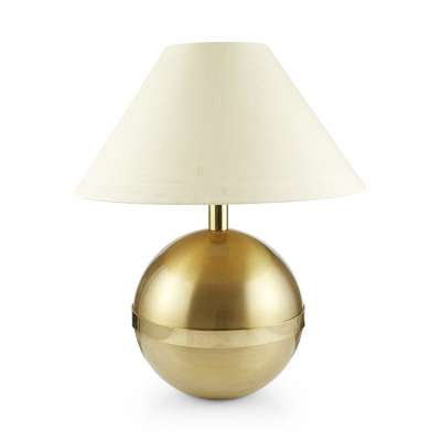 each of spherical form with a central brushed brass band, with maker's labels to the underside and white shades (2)