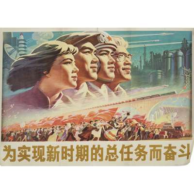 comprising: 'Advance bravely along the bright road shown by Chairman Mao's 7th May Instruction', 52.5cm x 76.5cm; 'Support the Anti-imperialist struggle of the People of the world', 77cm x 53cm; 'For the celebration of the 3rd Plenary Session of the 10th Central Committee of the Communist Party of China', 53cm x 76.5cm; and 'We will fight to fulfil the general mission of the new era', 76.5cm x 105cm (4)
