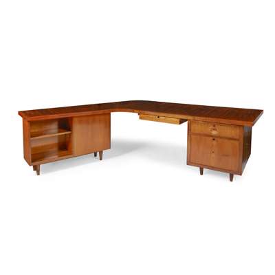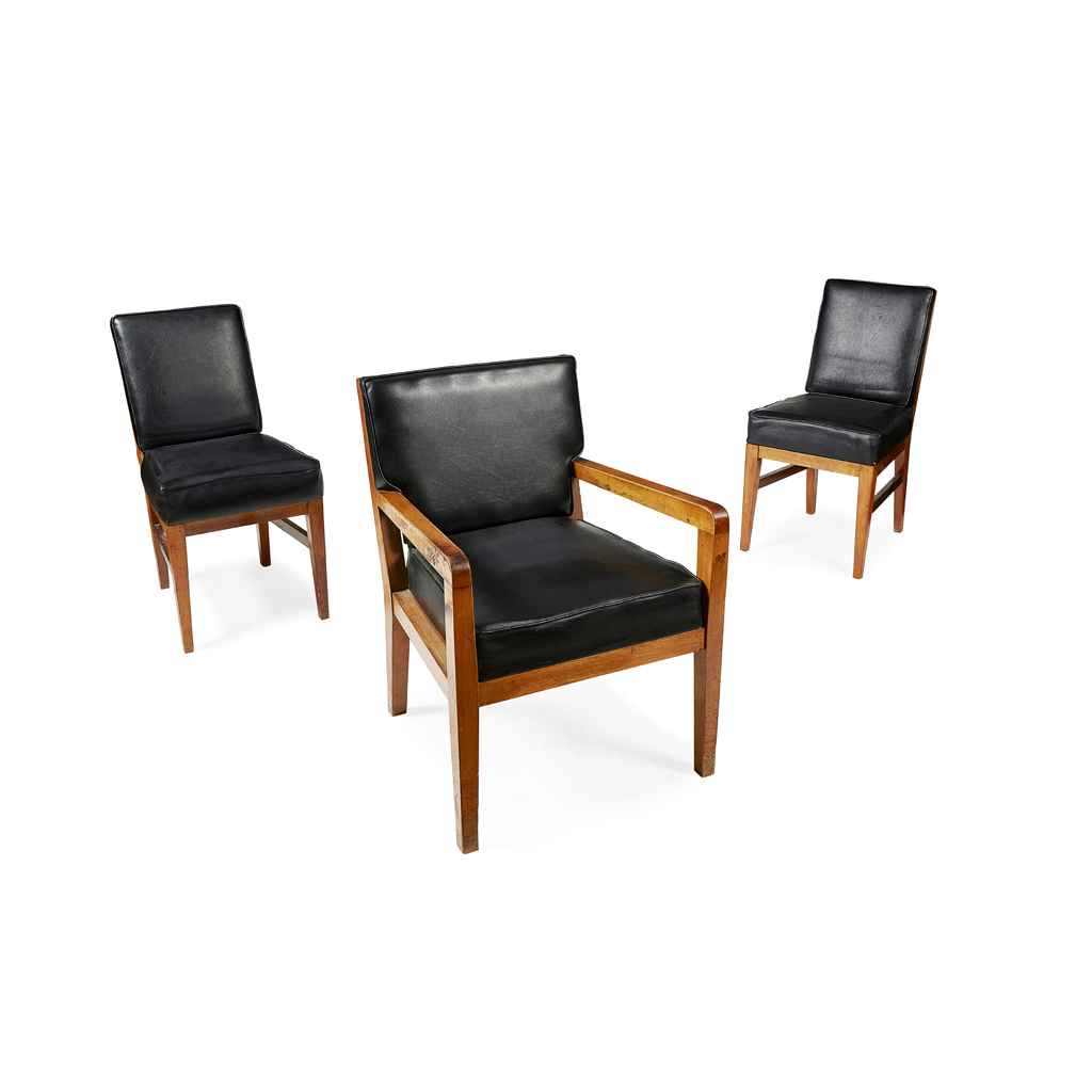 the DESK, with boomerang shaped top above central drawer flanked by two pedestals, one with three drawers, the other with opposed bookshelves, 309cm wide, 76cm high, 81cm deep; and THREE CHAIRS, an armchair and two side chairs, each with vinyl upholstery, armchair 59cm wide, 81cm high, 45cm deep, side chair 44cm wide, 84cm high, 38cm deep, each bears maker's label MORRIS MADE/ GUARANTEED TRADE MARK/ GLASGOW (4)