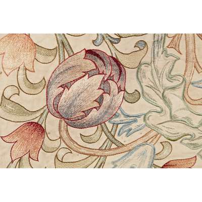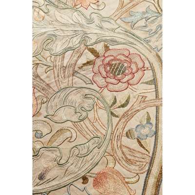 Under the guidance of May Morris, Dearle produced a series of portières featuring some of his most recognisable designs, including Owl (circa1895) now on display in the Victoria and Albert Museum. Whilst his artistic style always remains loyal to William Morris' aesthetic, the 1890s mark a clear attempt from Dearle to develop a mature, more individual artistic vision. Morris' early embroidery work typically features repeating patterns, yet in Acanthus, Dearle opts for a different design approach: a singular central acanthus motif which grounds the piece. He surrounds this dominating feature with a sensation for the eyes: interlocking vines and swirls of vibrantly coloured flowers. Among them are two of Dearle's most distinctive designs: the pointed-headed tulip and dark veining on various flowers and leaves. Designed on linen and embroidered in silk using a dazzling array of colours, the quality of the piece remains in keeping with the Arts and Crafts tradition, valuing the skills of the craftsman over industrial machinery. Another example of this portière exists in the Art Gallery of South Australia, Adelaide. Their version was embroidered by Mary Isobel Barr Smith: a woman from wealthy and influential family who furnished a great number of their homes with Morris & Co. fabrics and furnishings.