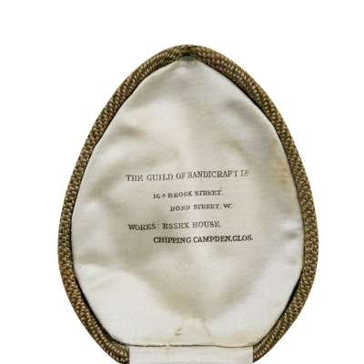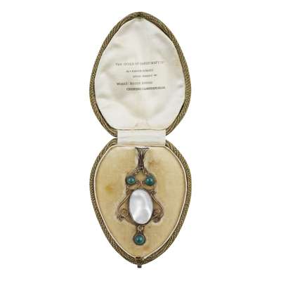 the central mother-of-pearl panel within a scrolling wirework surround, set with three circular chrysoprase cabochons, to a plain tapering bale, in original fitted box with velvet and silk lining bearing inscription THE GUILD OF HANDICRAFT LTS/ 16A BROOK STREET/ BOND STREET W/ WORKS: ESSEX HOUSE/ CHIPPING CAMPDEN GLOS.