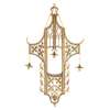 with three hanging light fittings suspended within frame with cut-out panels of Gothic tracery and foliate vines