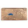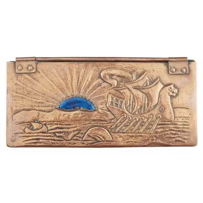 of rectangular form, depicting a stylised Viking ship with a blue enamel sun, opening to a void interior, on squat-bun feet