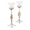 each with frilled Vaseline glass shades above a turned column with leafy brackets and raised on tripod base (2)