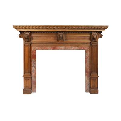 the moulded and gadrooned mantle shelf above a panelled frieze with applied busts above fluted jambs and enclosing a rouge marble slip
