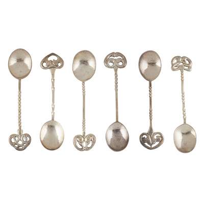 with stylised leaf terminals and planished bowls, stamped makers marks, hallmarked Birmingham 1904, within original case (6)