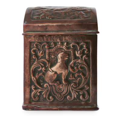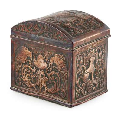 ARTS AND CRAFTS COPPER TEA CADDY, CIRCA 1895