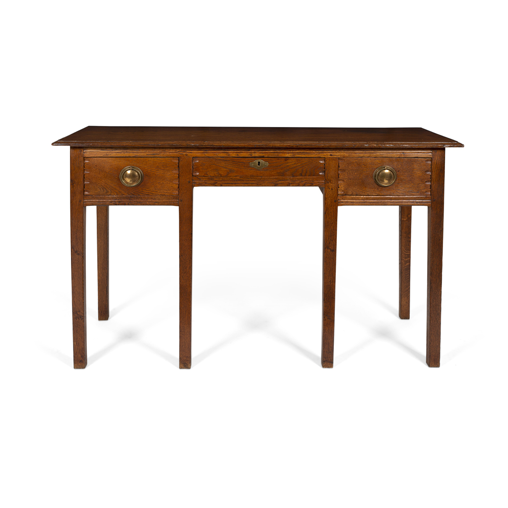the rectangular top above an arrangement of three drawers, raised on square legs, bears maker's label inscribed THIS PIECE, A SIMPLE OAK DRESSING TABLE NO. 267, WAS DESIGNED & MADE THROUGHOUT IN THE RUSSELL WORKSHOP IN JULY 1925/ DESIGNER S. GORDON RUSSELL/ FOREMAN E. TURNER/ CABINET MAKER G. COOK/ METALWORK P. WALKER
