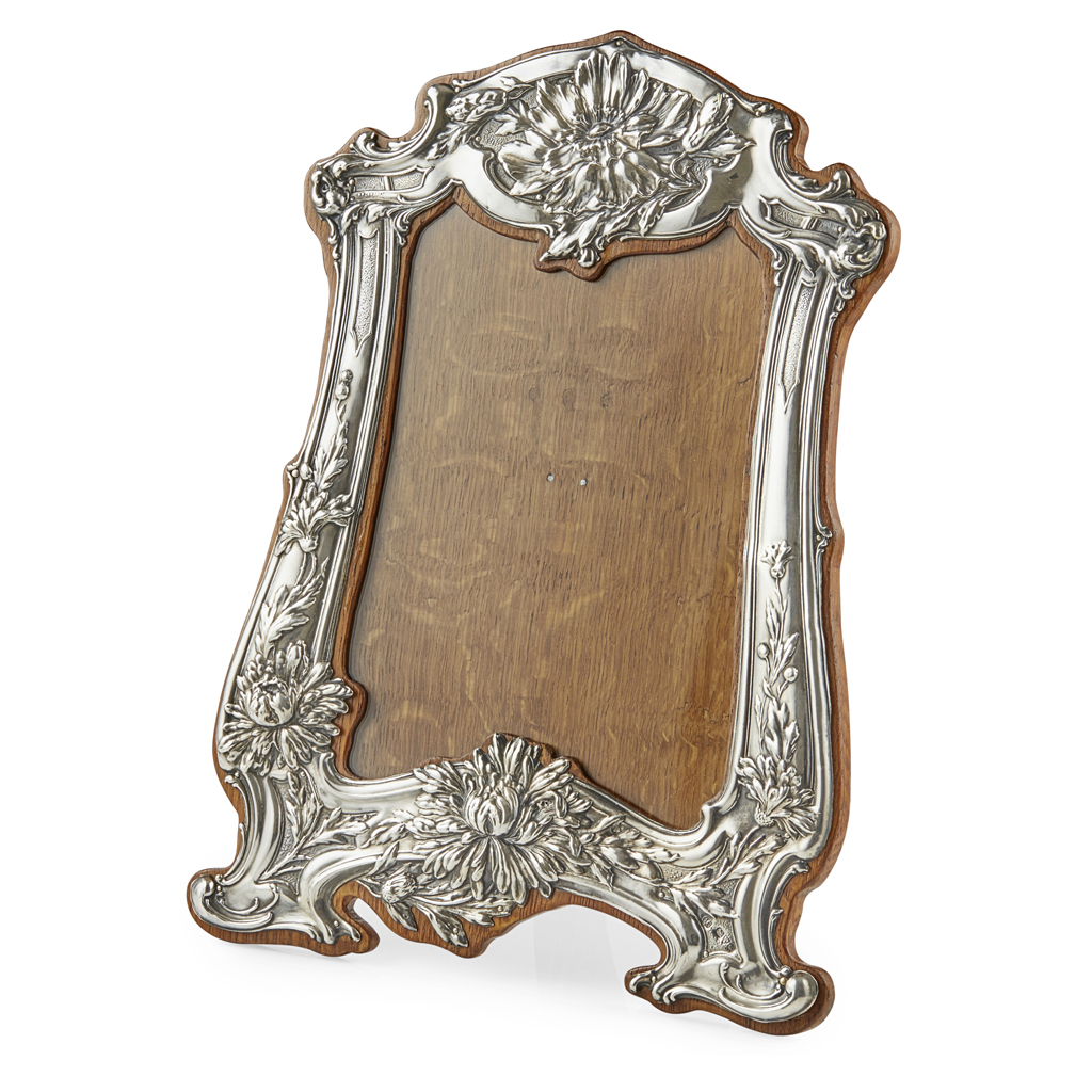 of shaped rectangular form, depicting chrysanthemums, maker's marks C.C and hallmarked Chester 1905, with later oak easel backing