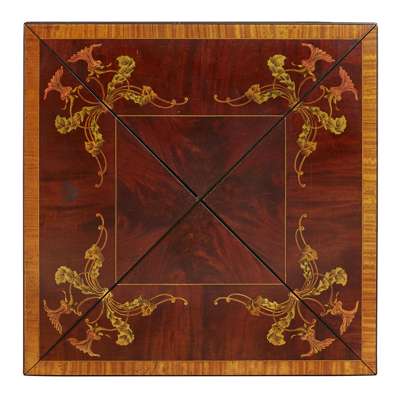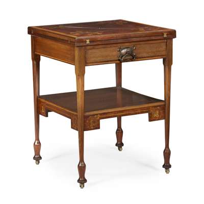 ART NOUVEAU MAHOGANY, SATIN WOOD AND MARQUETRY ENVELOPE CARD TABLE