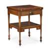 the square top inlaid with foliate arabesques, opening to reveal a tooled green baize playing surface with outer guinea wells, above a frieze drawer, raised on faceted tapered legs joined by an undertier with foliate inlaid brackets, ending in faceted baluster feet and brass castors