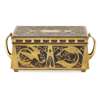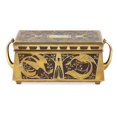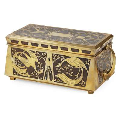 inlaid in brass with exotic birds and foliage, and with velvet-lined interior