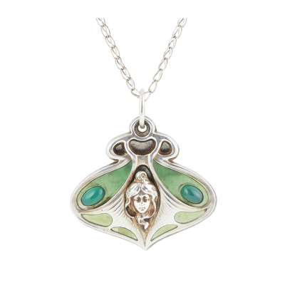 the elliptical hinged pendant cast with an Art Nouveau maiden and set with green cabochon stones, bears maker's marks verso 900/ depose