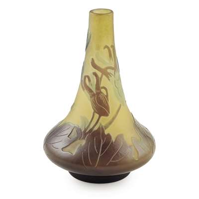 the frosted glass body overlaid in amethyst and acid etched with a design of aquilegia, cameo signature to body GALLÉ