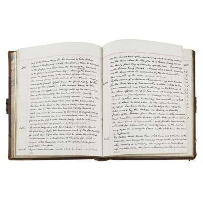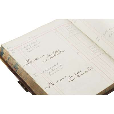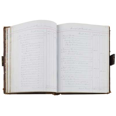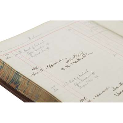 the first dated 31st December 1889 - 31st December 1903, manuscript accounts including records of sums owed by Miss Cranston Sauchiehall Street in 1903, Glasgow School of Art and the Glasgow Herald Buildings; the second dated 1st January 1901 - 31st December 1923 including details of Mackintosh's expenditures and fees and records of fees owed by the Glasgow School of Art and others, also included is a manuscript copy of the "Contract of Partnership between John Keppie Architect in Glasgow of the first part and Charles Rennie Mackintosh Architect there of the second part", with Mackintosh's signature appearing 13 times on the balance sheets, both volumes in uniform half calf over red cloth