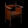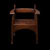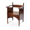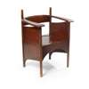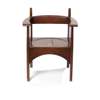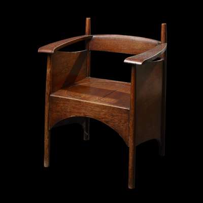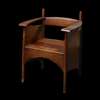 Combining English Arts & Crafts and Scottish vernacular design, Mackintosh produced three types of sturdy and generous seating for these rooms; a prominent ladderback armchair, its long, rectangular back rail adorned with ascending wooden slats; a cube shaped tub chair, the current example, which was a version of this chair without the tall back; and a stool, only seen in the Smoking Room from contemporary photographs. All of the furniture was either clear-varnished or dark-stained and waxed. The construction of the tub chair is traditional but the form anything but. The broad panels of sawn timber are stripped of decoration and the solid box shape is lightened with curved aprons and subtle detailing under the arms and back. Gently curved and moulded timbers to the arms and back and the distinctive tapering uprights on the angles demarcate the chair's compact, box-like composition. These details are repeated throughout the rooms, creating a balanced composition of expressive lines and simple organic shapes.