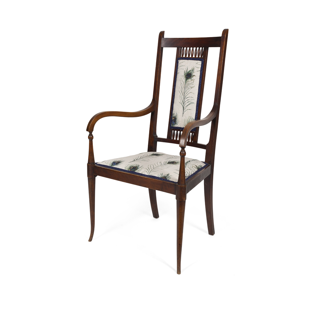 Note: This chair is an upholstered version of the chairs designed by Walton for Miss Cranston's Buchanan Street Tearooms in 1897, and which he subsequently used in some of his interiors including his own house, Elm Bank, in York in 1898.