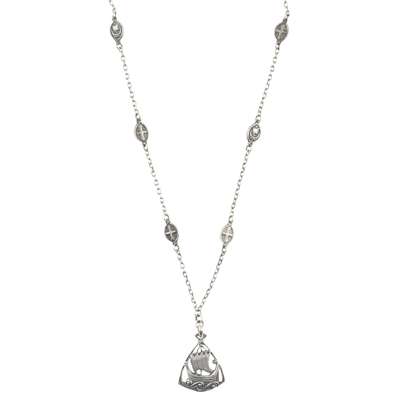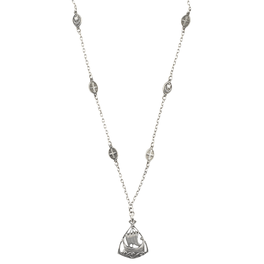 the pendant cast as a longboat in full sail, with heavy chain and elliptical spacers cast with crosses and longboats, stamped maker's marks A.R./ IONA