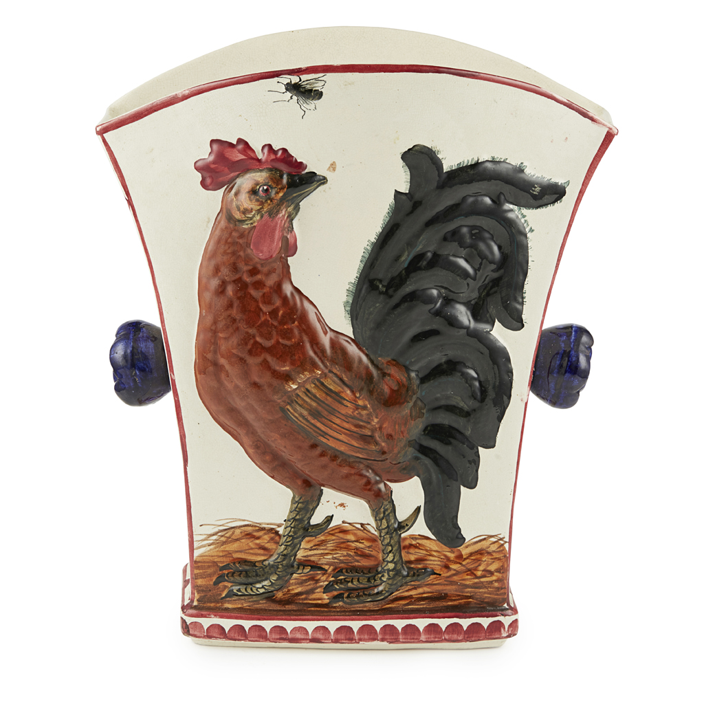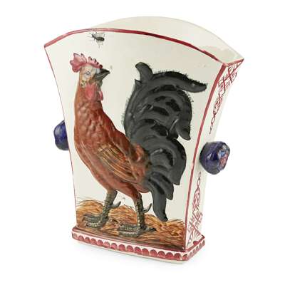 moulded in relief to one side and painted with a cockerel chasing a fly, and to the other with a group of dahlias, the sides with applied rosette bosses, painted maker's marks R.H.&S./ FIFE POTTERY