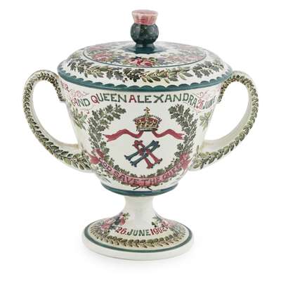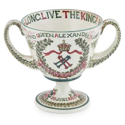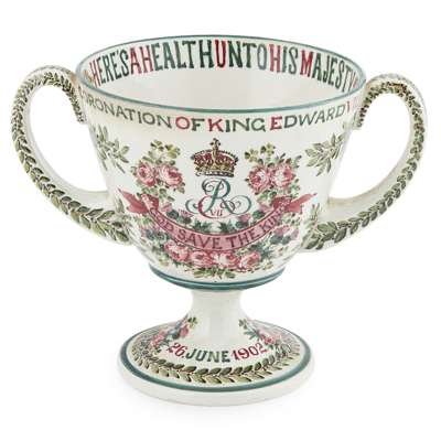 probably decorated by Karel Nekola, depicting the royal crown and monogram of King Edward VII within a field of roses, thistles and acorns, bearing inscription CORONATION OF KING EDWARD VII 1902 AND QUEEN ALEXANDRA 26 JUNE 1902/ LONG LIVE THE KING/ HERE'S A HEALTH UNTO HIS MAJESTY, impressed mark WEMYSS WARE/ R. H. & S., painted retailer's mark T. GOODE & CO.