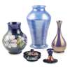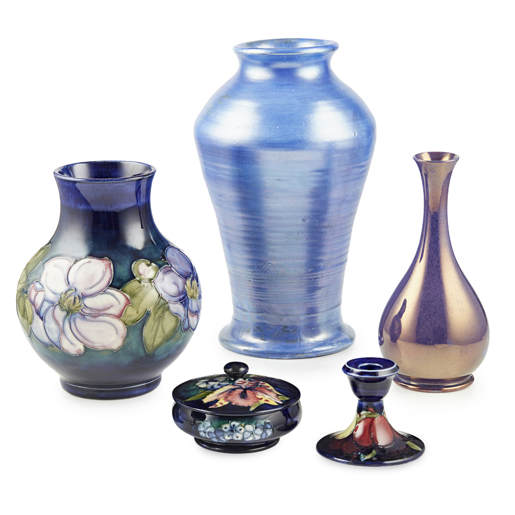 20cm high; a SELF-COLOURED TAPERED VASE, 28cm high; a SELF-COLOURED BOTTLE VASE, 20cm high; an 'ORCHIDS' PATTERN BOX AND COVER, 11.5cm diameter and 'PLUM WISTERIA' PATTERN CANDLESTICK, 8cm high; each with impressed and painted maker's marks (5)