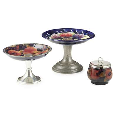 with hammered pewter base, 21.5cm diameter; a 'POMEGRANATE' PATTERN TAZZA, with chromium plated base, 18.5cm diameter; and a 'POMEGRANATE' PATTERN PRESERVE JAR AND COVER, 9.5cm high, each with impressed and painted maker's marks (3)