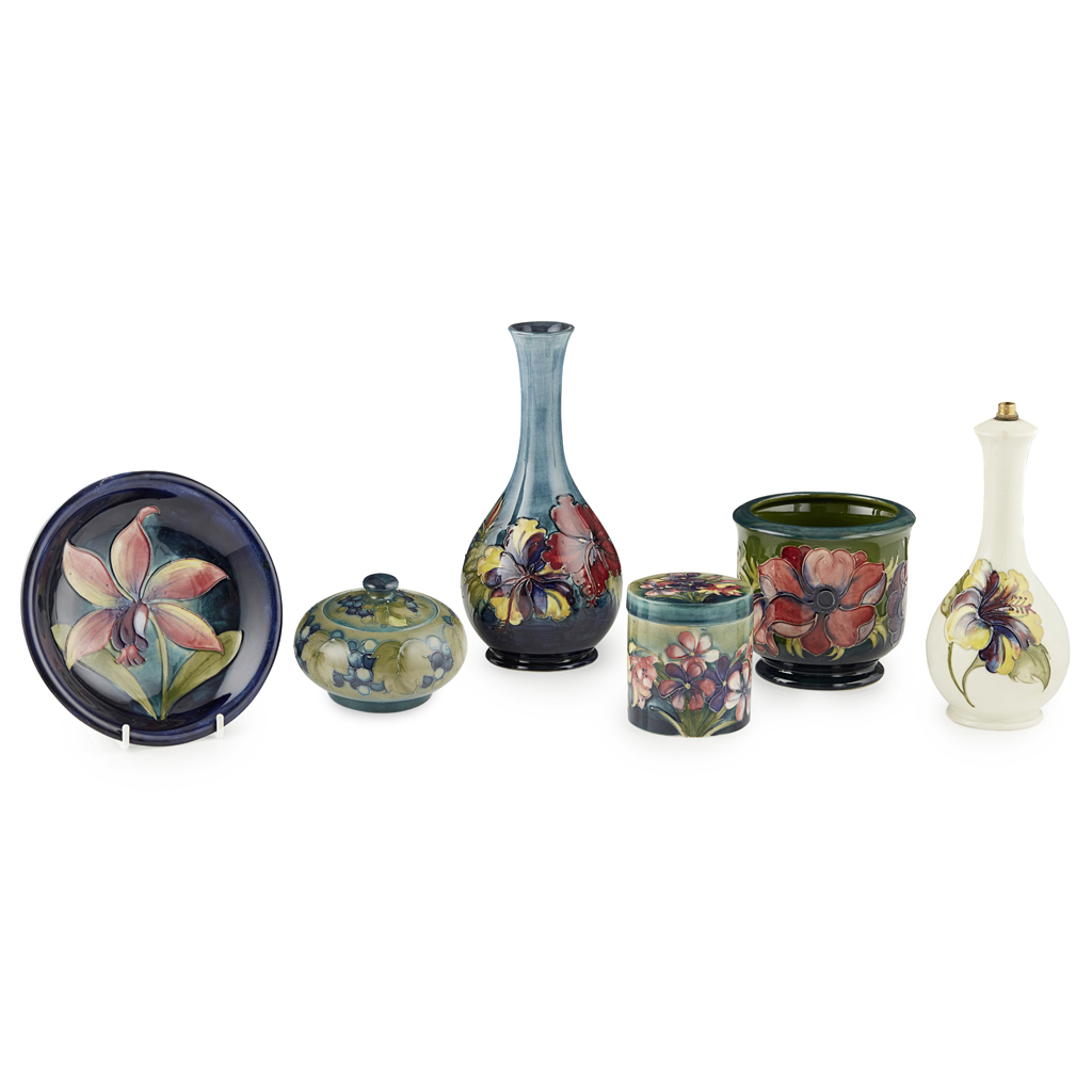comprising a 'LEAF & BERRY' PATTERN BOX AND COVER, 12cm diameter; a 'HIBISCUS' PATTERN LAMP BASE, 21cm high; a 'HIBISCUS PATTERN VASE, 25cm high; an 'ORCHID' PATTERN PLATE, 19cm diameter; an 'ANEMONES' PATTERN JARDINIÈRE, 12.5cm high; a 'LEAF & BERRY' PATTERN LAMP BASE, 17cm high; and a 'SPRING FLOWERS' PATTERN BOX & COVER, 9.5cm high (6)