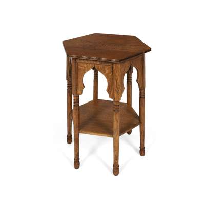 the hexagonal top above arcaded frieze on ring turned legs united by a lower tier