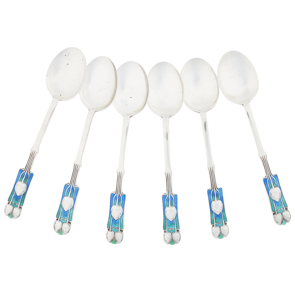SET OF SIX 'CYMRIC' SILVER AND ENAMEL COFFEE SPOONS, BIRMINGHAM 1929