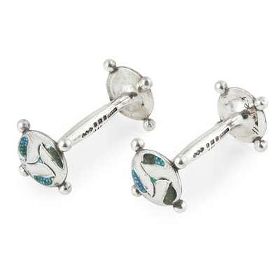 PAIR OF 'CYMRIC' SILVER AND ENAMEL KNIFE RESTS, BIRMINGHAM 1905