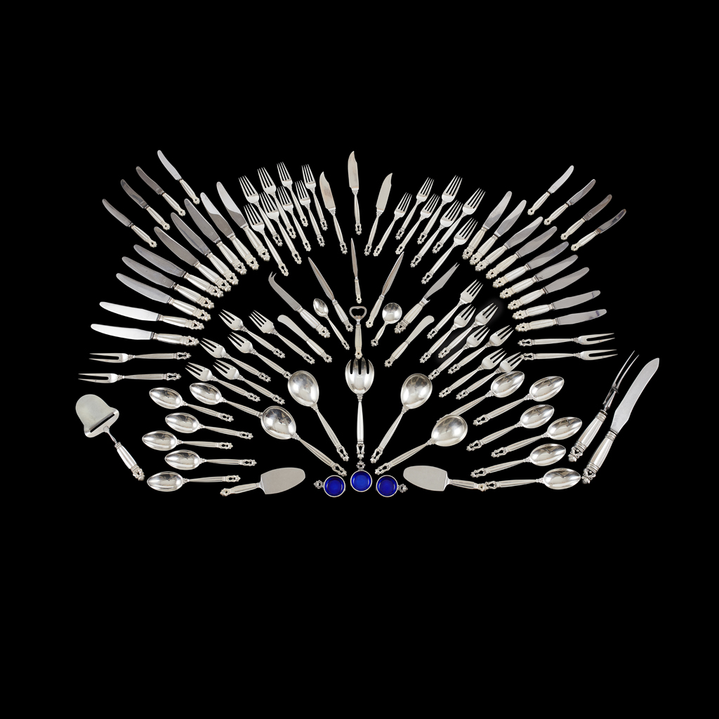 comprising 6 Soup Spoons; 10 Dinner Knives; 8 Dinner Forks; 9 Side Knives; 3 Fish Knives; 2 Fish Forks; 6 Dessert Spoons; 7 Dessert Forks; 11 Cake Forks; 8 Cake Knives; 2 Butter Knives; 4 Pickle Forks; 2 Cheese Knives; 1 Teaspoon; 4 Serving Spoons; 1 Salad Server; 1 Carving Knife and Fork; 2 Cake Slices; 1 Cheese Slicer; 1 Caddy Spoon; 3 Salts; 3 Letter Openers; 1 Bottle Opener, stamped maker's marks GEORG JENSEN/ STERLING/ DENMARK (96)
