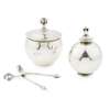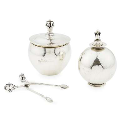the final cast with a foliate motif above a planished spherical body, with stamped maker's marks GI/ DENMARK/ 172/ STERLING/ 925.S, 10cm high; a PAIR OF GEORG JENSEN SILVER SUGAR TONGS, CIRCA 1930, the handles cast with acorns and leaves, with stamped maker's marks, GEORG JENSEN/ STERLING DENMARK/ 925, 10cm long; and a HARALD NIELSEN SILVER CACHEPOT, 1930'S, the final cast with a foliate motif above a planished spherical body, with stamped maker's marks GEORG JENSEN/ HN/ GI 925 S, 10.5cm high (3)