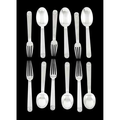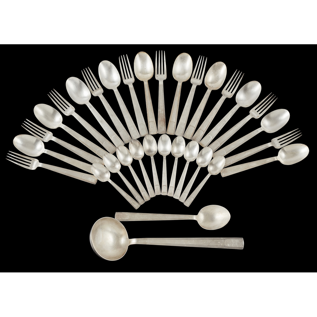 comprising SIX DESSERT SPOONS; and SIX DESSERT FORKS, each with applied roundels with Art Deco initial S, stamped maker's marks; also a SUITE OF ART DECO WHITE METAL CUTLERY BY CHRISTOFLE, PARIS, CIRCA 1930, comprising 10 Dinner Forks; 10 Soup/ Dessert Spoons; 10 Tea Spoons; 1 Serving Spoon; and a Soup Divider, each with stamped maker's marks CHRISTOFLE (44)