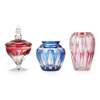 with etched signature VAL ST. LAMBERT, 26.5cm high; also two unmarked glass vessels including a BALUSTER VASE, with blue flash-coloured decoration, 16.5cm high; and a SHOULDERED VASE, with pink flash-coloured decoration, 21.5cm high (3)