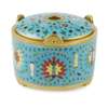 of cylindrical form with pierced cover, decorated in gilt and coloured enamels on a turquoise ground, apparently unmarked